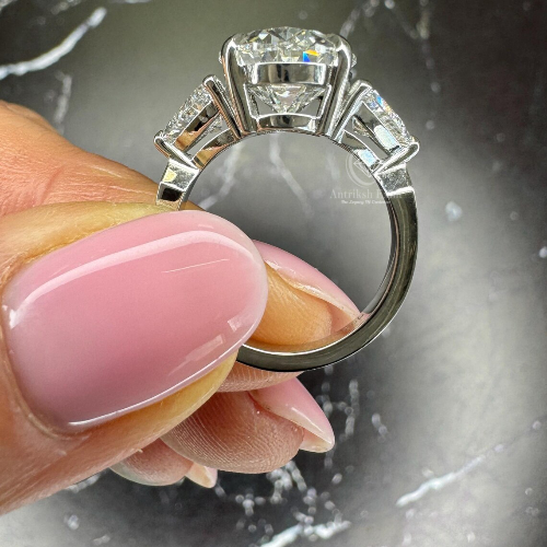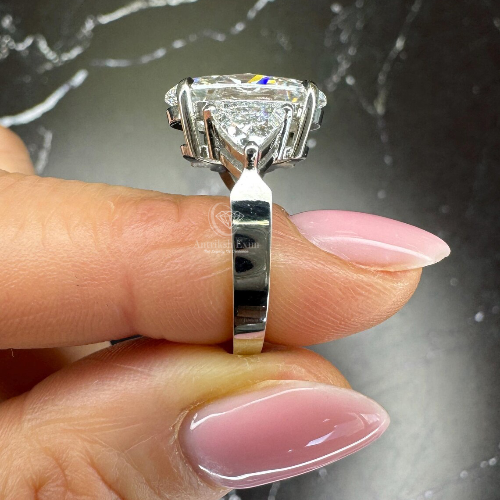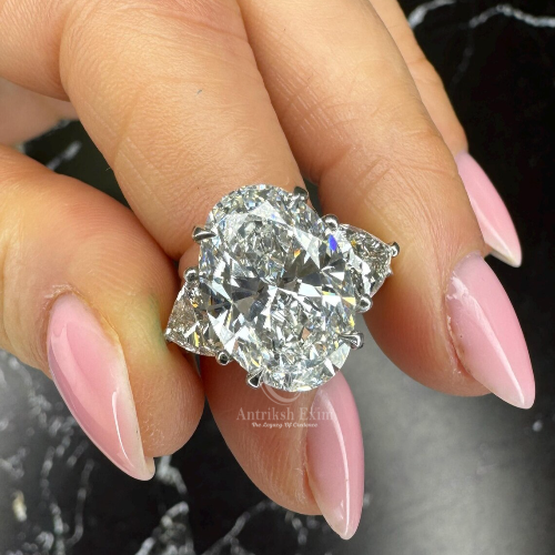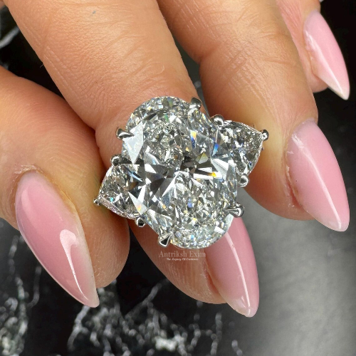 Oval Cut 7 carat IGI Certified F Color VS1 Clarity Lab Grown Diamond Three Stone Engagement Ring, Side Trillion Cut Diamonds, Solid Gold