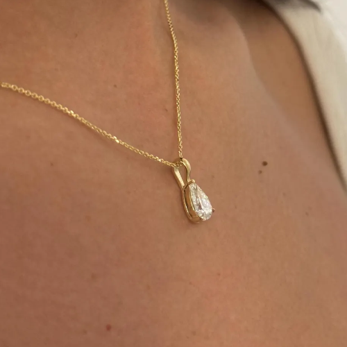 This 14k gold necklace features a marquise cut moissanite. You can choose from a variety of chain lengths for different oufits. Solid gold is always a popular and durable option for a classic look.